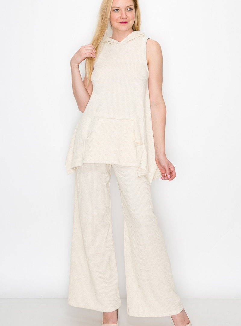 Ivory Sleeveless Hooded Top Wide Leg Maxi Pants Comfy Day Night Lounge Set