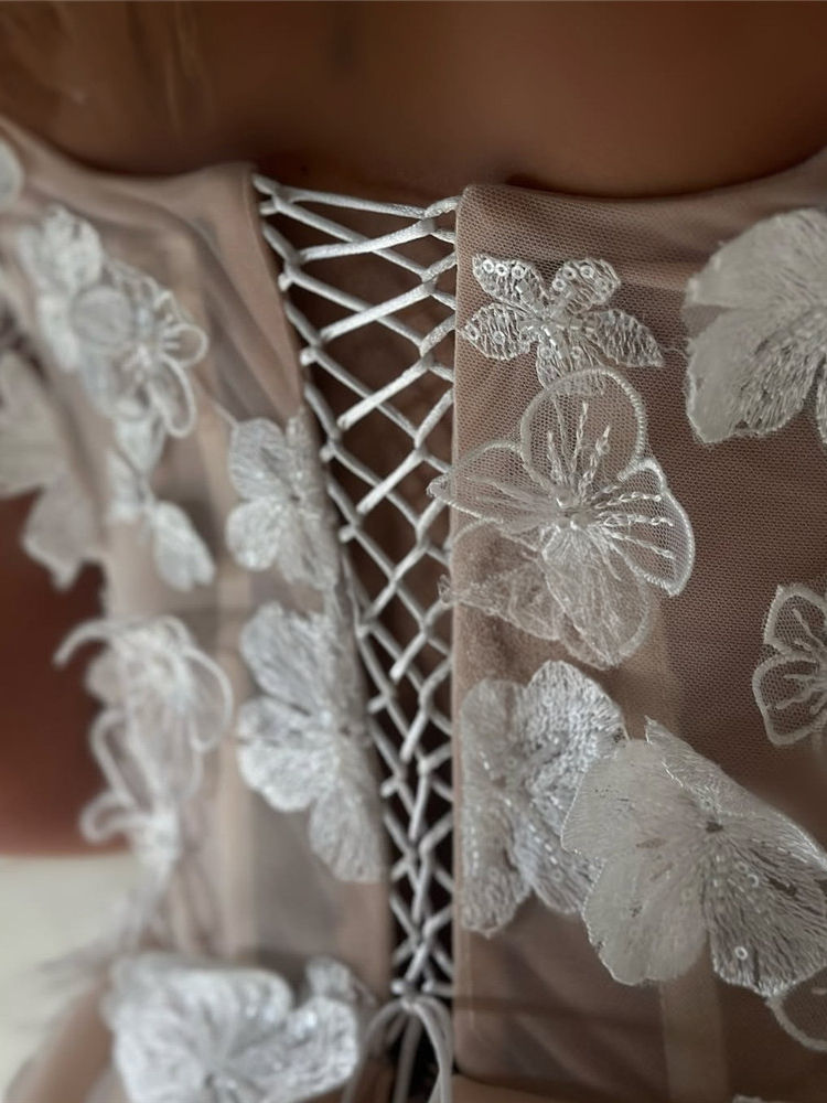 This A-line wedding dress offers a classic silhouette with modern details. It features a sweetheart neckline, off-the-shoulder sleeves, and a striking backless design. Designed for comfort and elegance, it includes a built-in bra and can be custom-fitted to your measurements.
