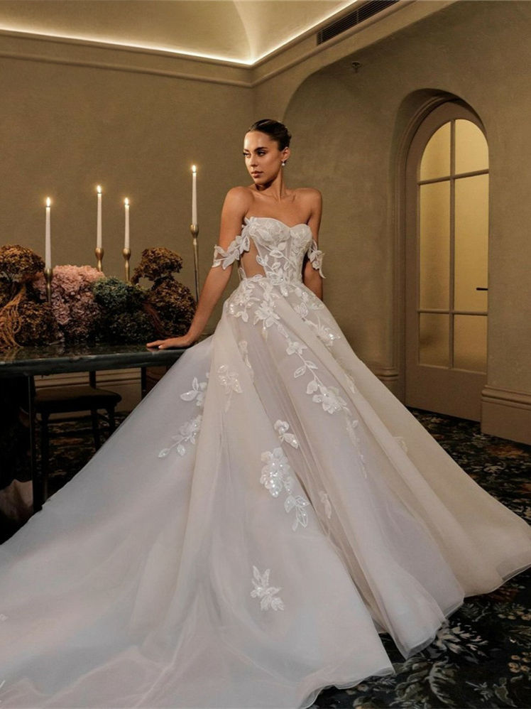 A-Line Sweetheart Off Shoulder Wedding Dress Floor-Length Court Train Backless T