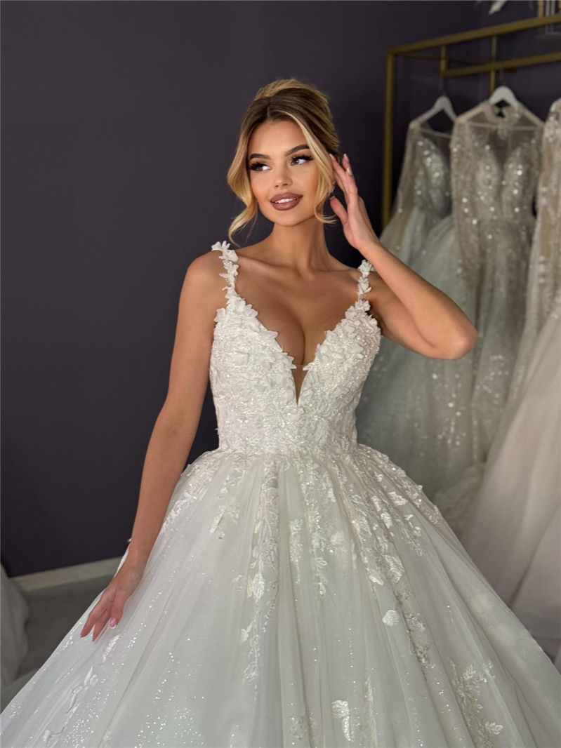 A-Line V-Neck Sleeveless Wedding Gown Lace Appliques Tulle Backless Court Train