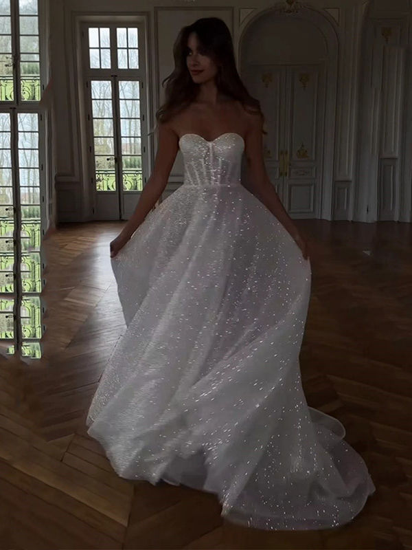 Long A-Line Tulle Wedding Dress Sweetheart Sleeveless Backless Glitter Gown
