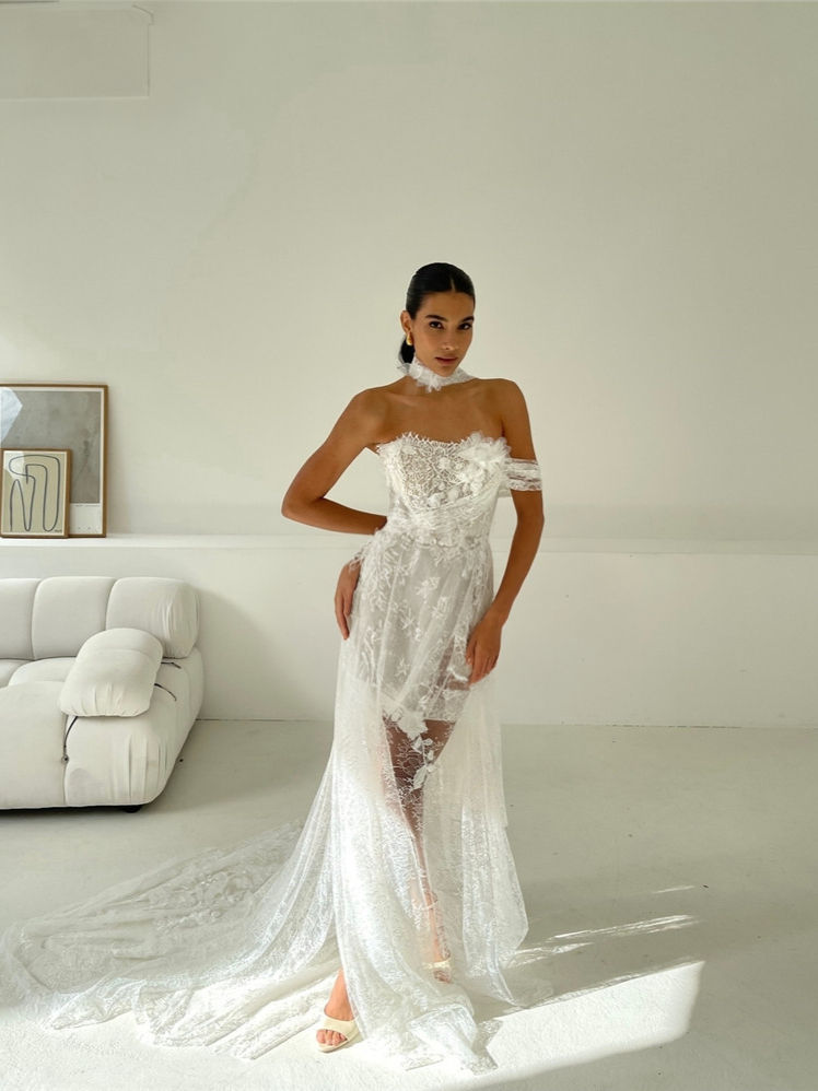 This A-line wedding gown offers a timeless silhouette with a sweetheart neckline and a graceful court train. Designed for comfort and elegance, it features a built-in bra and a secure zipper back closure, ensuring a smooth fit for your special day.