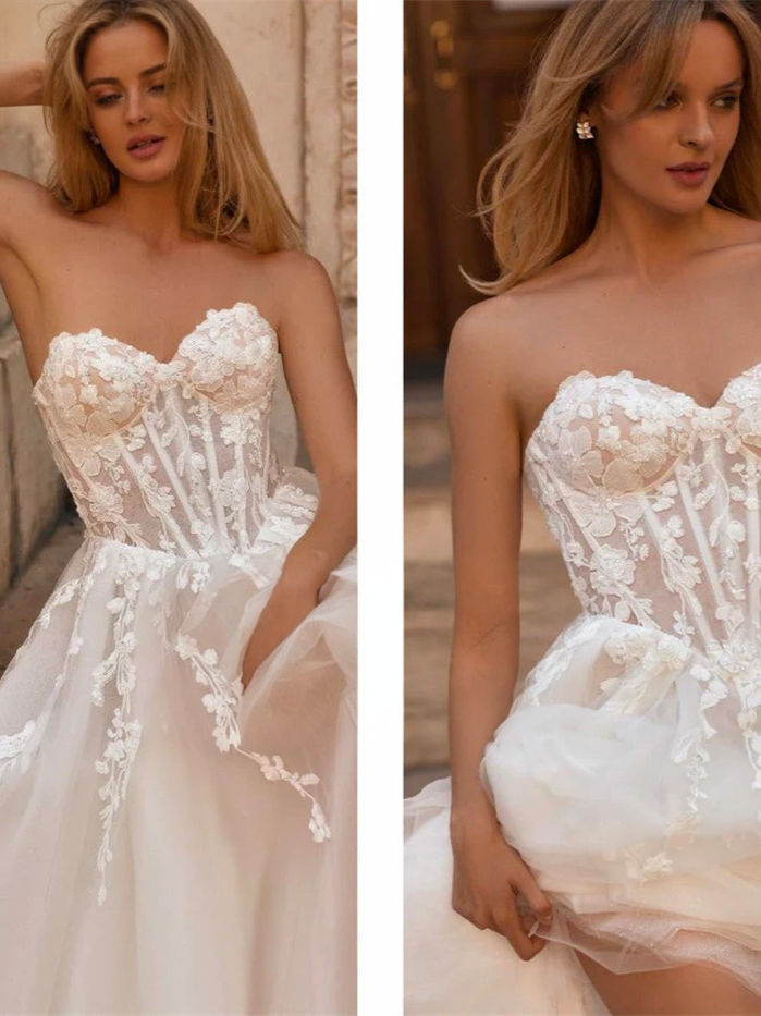 Sleeveless A-Line Wedding Dress Sweetheart Neck Backless Lace Tulle Court Train