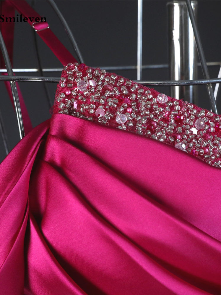 This is a floor-length satin prom dress, designed for impact. It features an off-the-shoulder neckline and a backless design, creating a clean, sophisticated line. With a built-in bra and subtle pleat detailing, it offers a complete look.Materials:- Bamboo Fiber- POLYESTERPair it with: