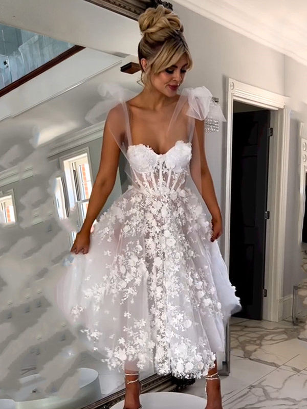 Spaghetti Strap Sweetheart Lace Tulle A-Line Wedding Dress Tea Length Backless