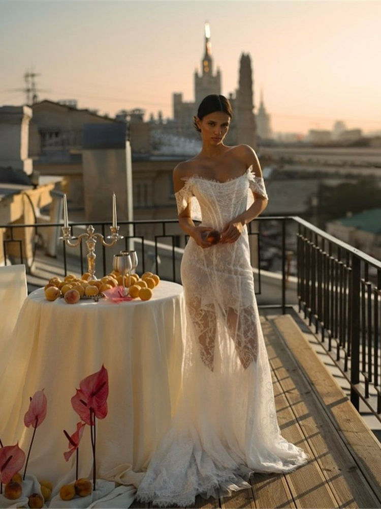 A-Line Satin Wedding Dress Strapless Off Shoulder Backless Court Train Floor-Len