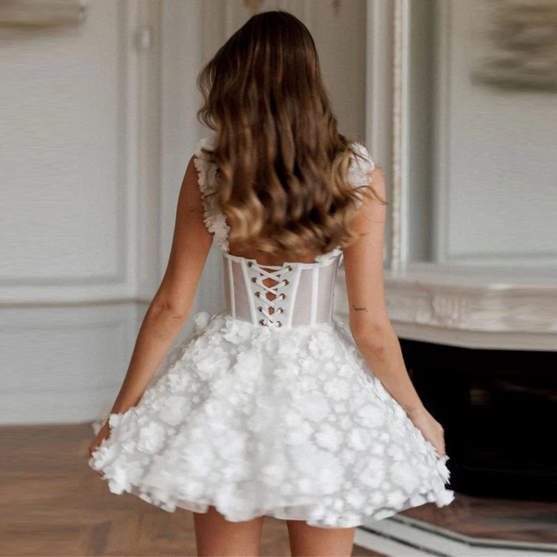 White A-Line Mini Wedding Dress Sleeveless with 3D Floral Appliques Lace Up Back