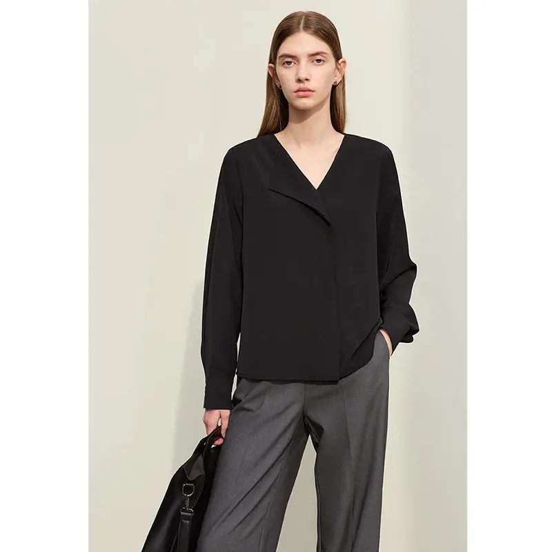 Embrace effortless elegance with this loose-fitting chiffon blouse. Designed for a comfortable and stylish look, this piece features a flattering V-neckline and asymmetrical details, making it perfect for any occasion. Wear it alone or layer it over a tank top for a chic and versatile style.