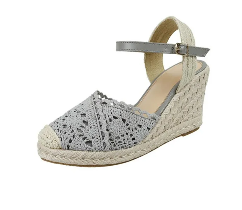 Straw Toe Mesh Ankle Strap Wedge Sandals - Slingback Buckle