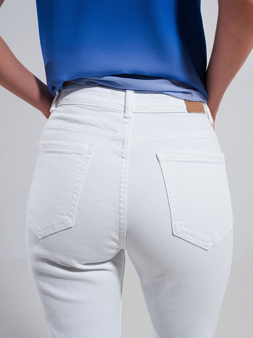 White Stretch Cotton Skinny Jeans Full Length Casual Basic Five Pockets Zip