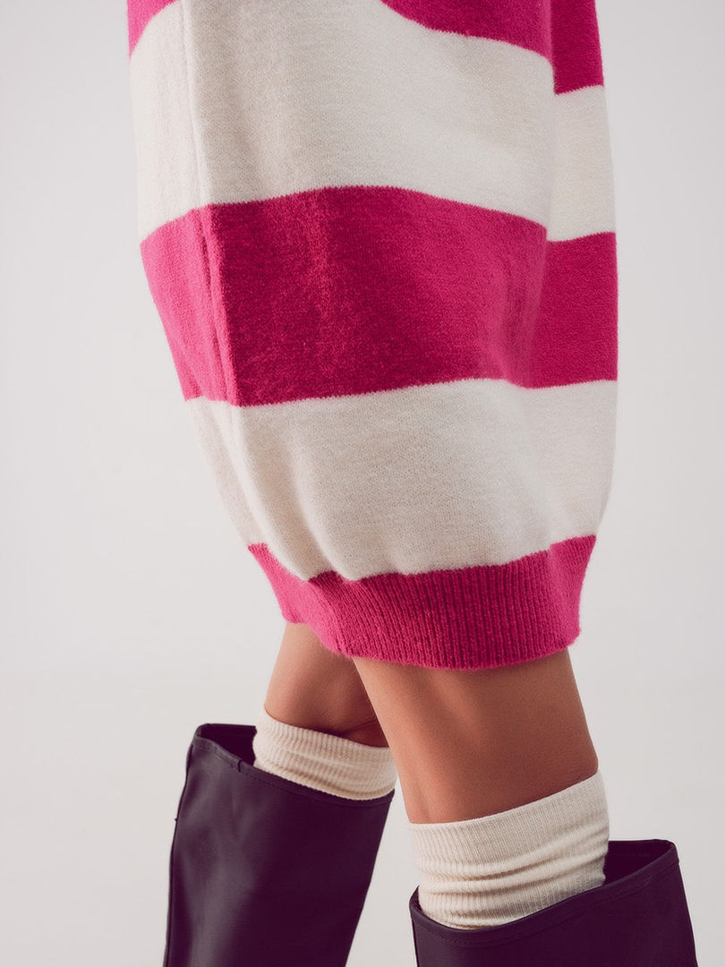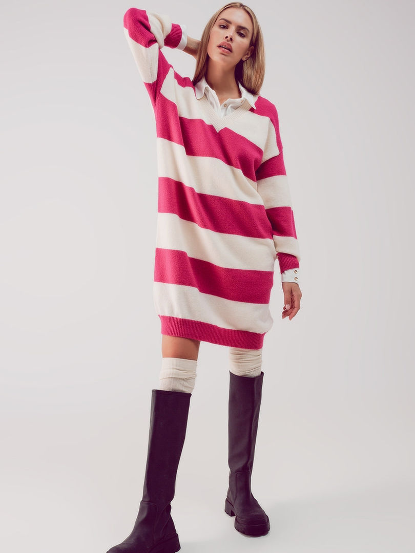 Length: Cropped length. Subcategory: Dress. Collar: V-neck neckline. Sleeves: Long Sleeves. Print: Stripe design. Fit: Relaxed fit. Style: Comfy. Detail: Ribbed trims. Fabric: Chunky knit. runs true to size. U.