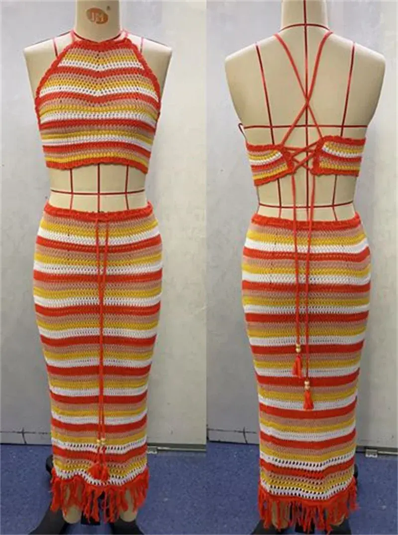 Striped Backless Crop Top Tassel Knit Dress Boho Casual Beachwear