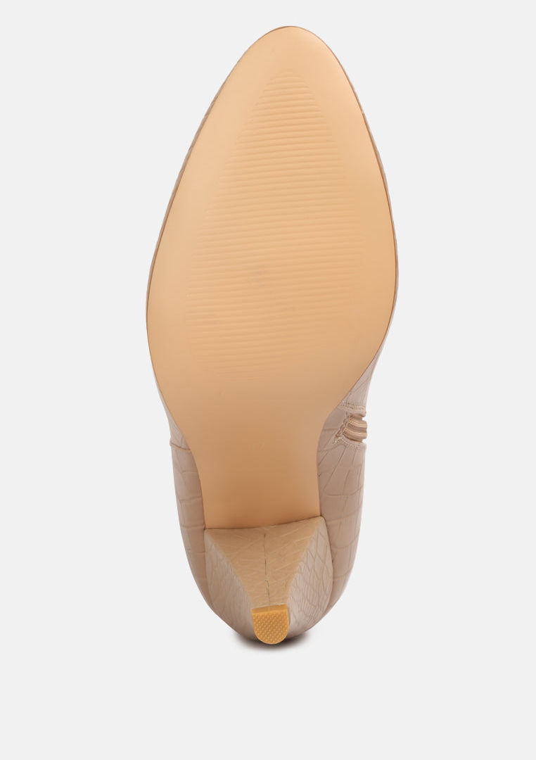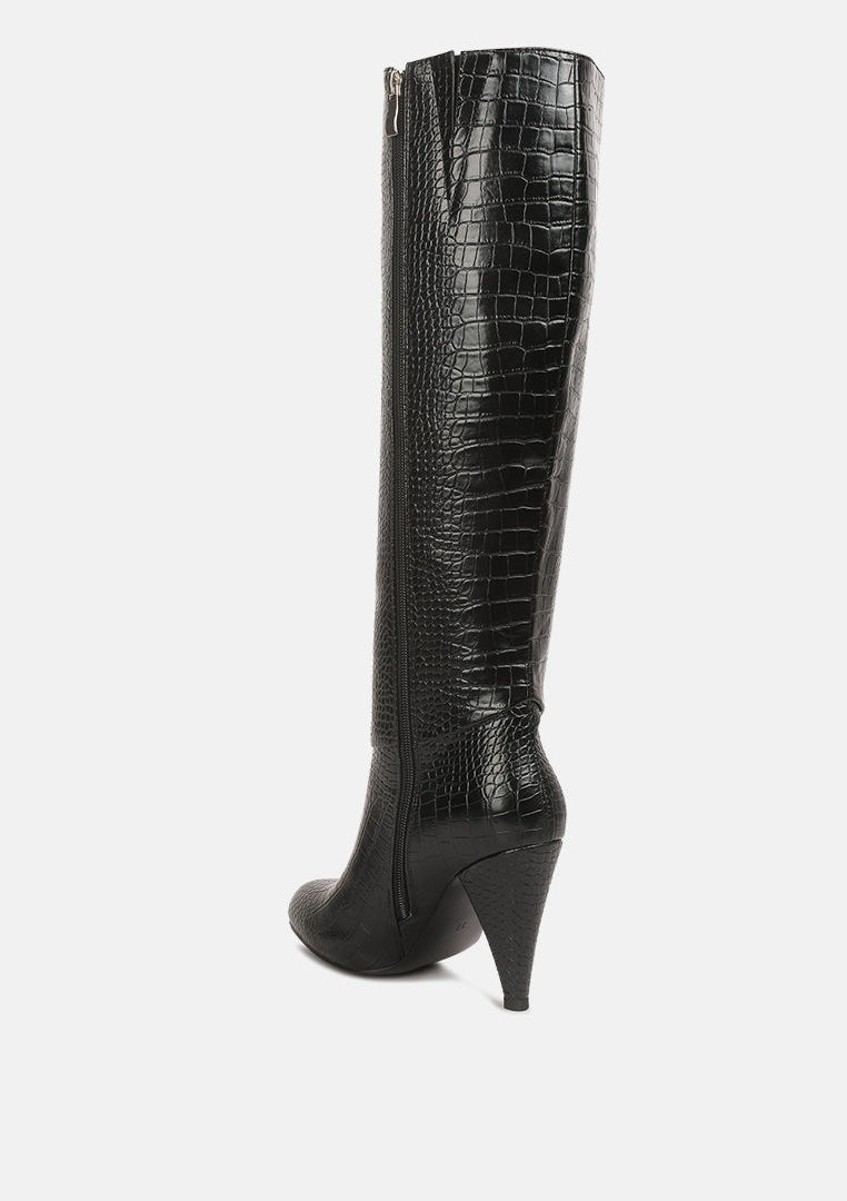 Tags: women's heeled croc boots, stylish calf boots for winter, comfortable winter fashion boots, croc texture heeled boots, panelled design calf boots, lightly padded insole boots, versatile winter boots for dresses, boots for tight pants outfits, chic party boots for women, elegant brunch footwear, faux crocodile boots women, synthetic lining heeled boots, TPR sole winter boots, textured calf height boots.