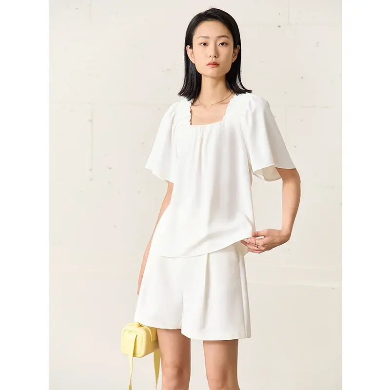 Elevate your summer wardrobe with this effortlessly chic shirt. Crafted from a lightweight and breathable fabric, this piece offers both comfort and style. The square collar and raglan sleeves add a touch of sophistication, while the solid pattern allows for versatile pairing options.