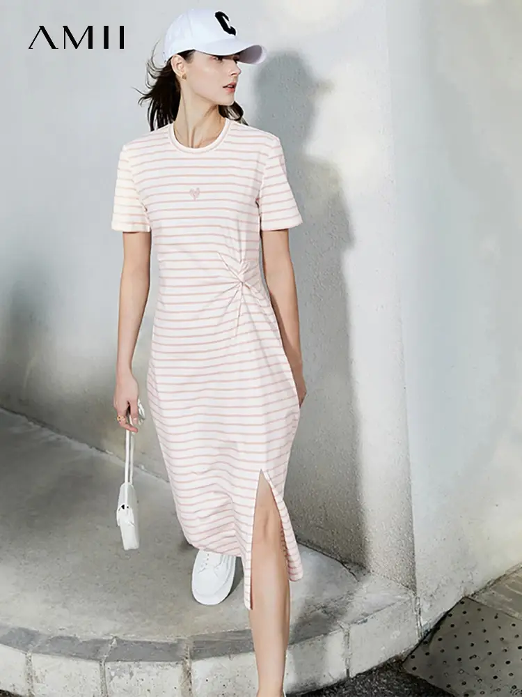 Embrace effortless style with this knee-length knitted dress, perfect for a variety of summer occasions. Crafted with a comfortable blend of cotton and spandex for a flattering fit, its elegant A-line silhouette and striped pattern create a chic and modern look that's sure to turn heads.