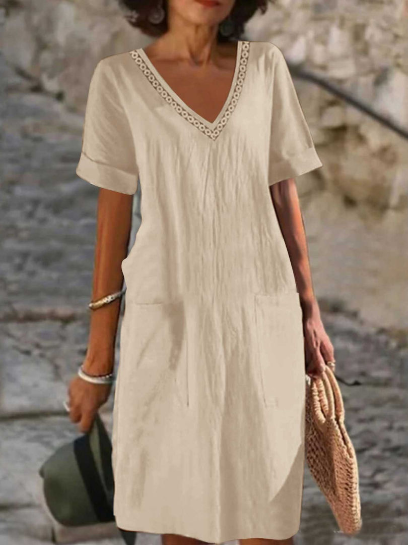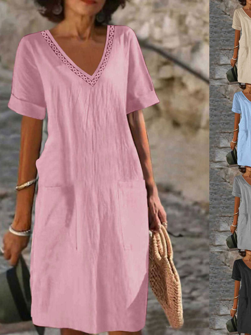 Casual O-Neck Sleeveless Knee-Length Polyester Solid A-Line Dress with Pockets