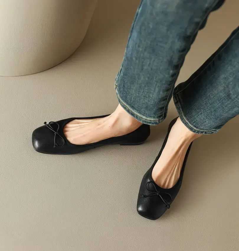 women's leather flats with bow, comfortable slip-on summer shoes, breathable leather flats for women, round toe flats with butterfly knot, casual leather shoes for warm weather, stylish flat shoes for everyday wear, genuine leather flats for ladies, easy wear women's summer footwear, feminine flats with knot detail, comfortable work flats for women, versatile leather slip-on shoes, cute summer flats for women, pigskin insole comfortable flats, rubber sole flat shoes.