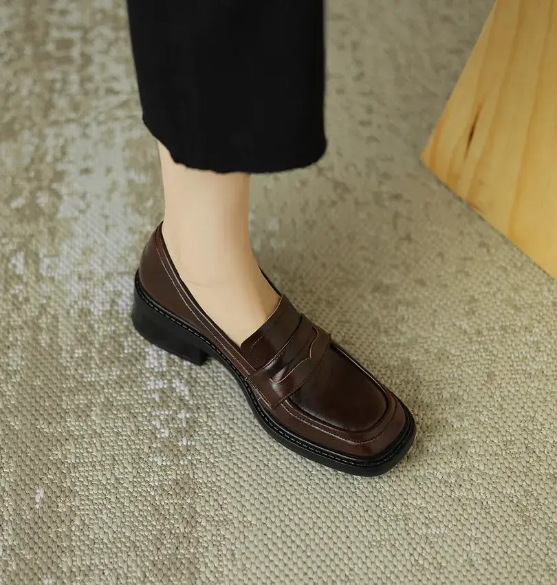 Tags: women's leather platform loafers, comfortable summer work shoes, stylish slip-on loafers for women, handcrafted leather loafers, 4.5 cm platform shoes, breathable leather shoes for summer, round toe platform loafers, minimalist style women's shoes, British inspired footwear, versatile casual loafers, genuine leather slip-on shoes, square heel platform loafers, chic summer footwear for women, easy slip on leather shoes.