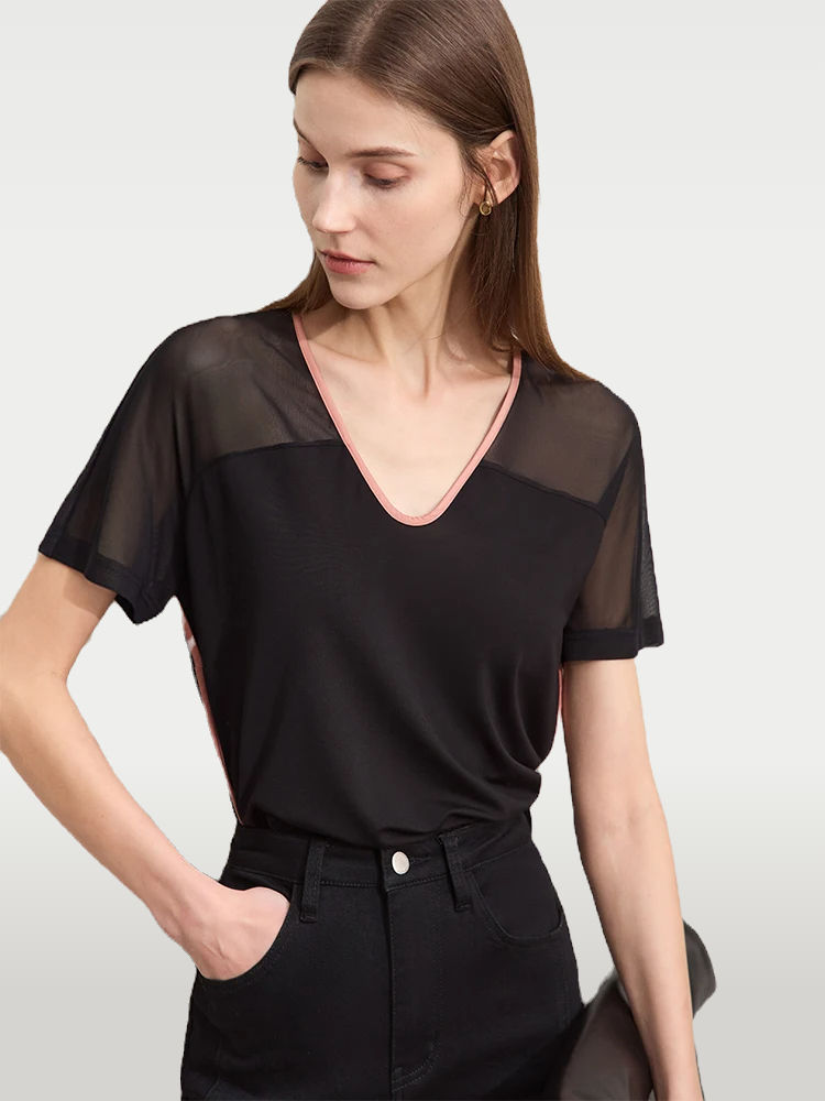 Summer V-Neck Contrast Stitch Spliced T-Shirt