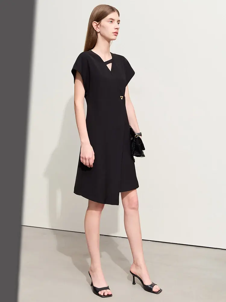 Elevate your summer style with this chic and sophisticated knee-length dress. Crafted from a lightweight and flowing chiffon fabric, this A-line silhouette flatters every figure with its asymmetrical design and flattering V-neckline. Perfect for any occasion, this dress embodies modern elegance and effortless charm.