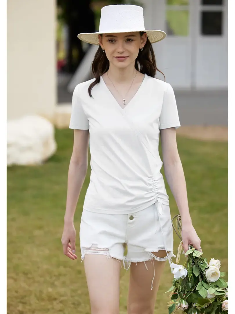 Embrace effortless style with this chic and comfortable tee. Crafted from soft cotton jersey, this top features a flattering V-neckline and delicate shirring detail that accentuates your figure. Perfect for everyday wear, this versatile piece will effortlessly elevate any outfit.