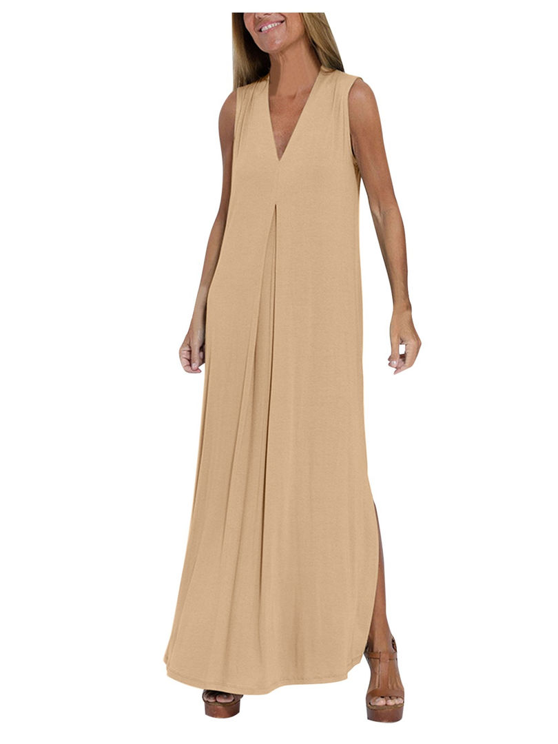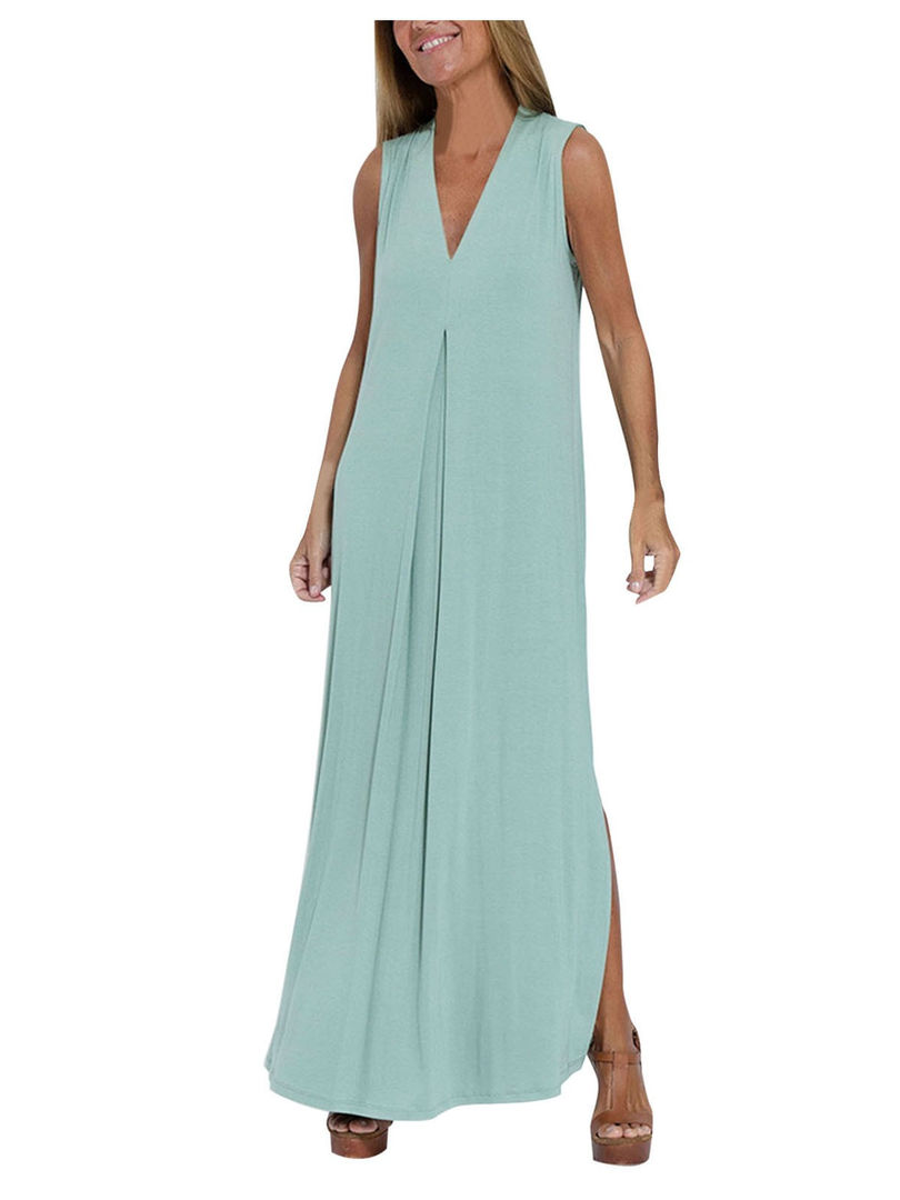 women's solid A-line dress, sleeveless knee-length dress, high stretch casual dress, O-neck summer dress, polyester blend dress, comfortable everyday dress, junior women's casual wear, natural fiber blend dress, regular fit summer dress, simple solid color dress, versatile sleeveless dress, breathable summer attire, easy care casual dress, knee length A line dress.
