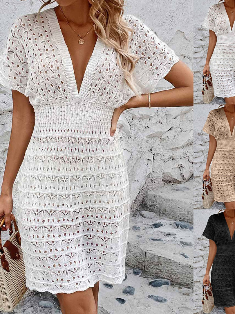 White Sleeveless Deep V-Neck Knitted Crochet Hollow Knee-Length Polyester Dress