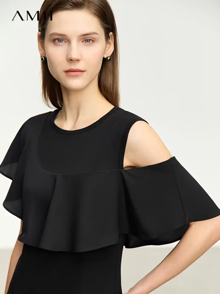 This dress is a stylish and comfortable option for women seeking a flattering and versatile piece for their wardrobe. The asymmetrical silhouette creates a unique and modern look, while the flounced edge adds a touch of femininity. The slim fit and knee-length design make it perfect for both casual and office settings.