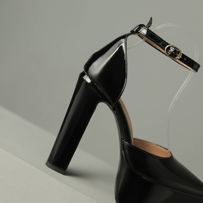 The high-gloss patent leather establishes the tone, leading to a distinctly pointed toe. The lift is significant, thanks to a substantial block heel elevated by a platform. It's a slingback, secured with a buckle strap that hints at the ankle. Underneath, a rubber sole provides a practical foundation, while the interior offers a smooth feel with a PU lining and insole.
