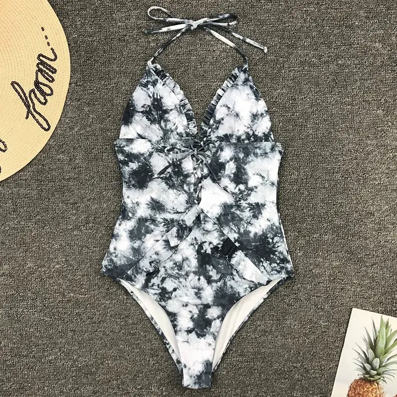 Tie Dye Lace Up One Piece Swimsuit Deep V Neck