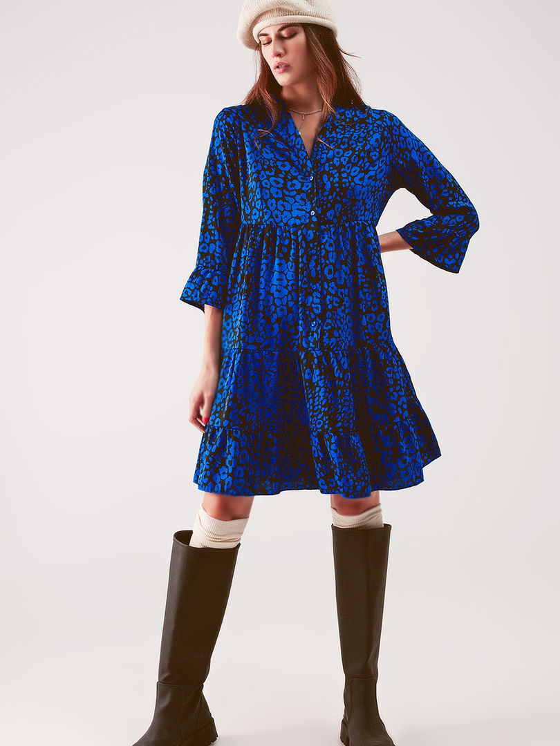 Blue Animal Print Mini Dress with 3/4 Sleeves, Grandad Collar, Lightweight Woven