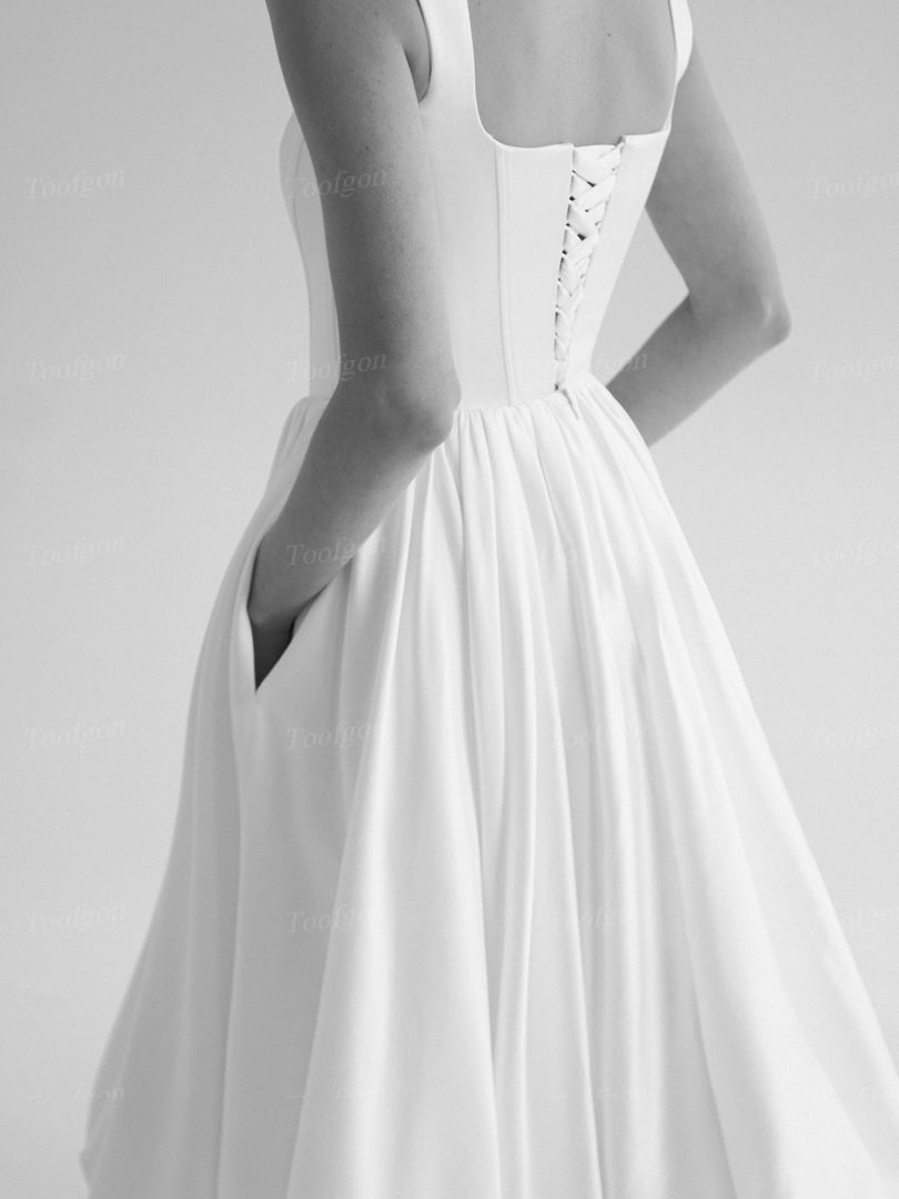 A-Line Soft Satin Short Wedding Dresses with Pockets, Square Collar, Lace-Up Bac