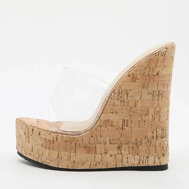 Transparent Open Toe Platform Wedge Slides PVC Upper Wooden Sole High Heels
