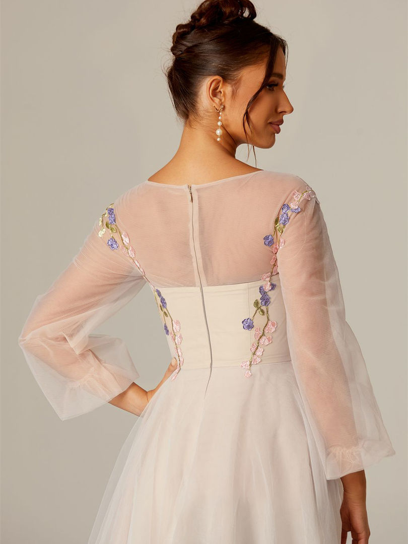 Tulle Lace A-Line Evening Dress, O-Neck, Full Sleeve, Floor-Length Formal Occasi