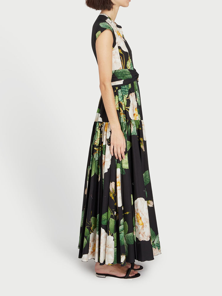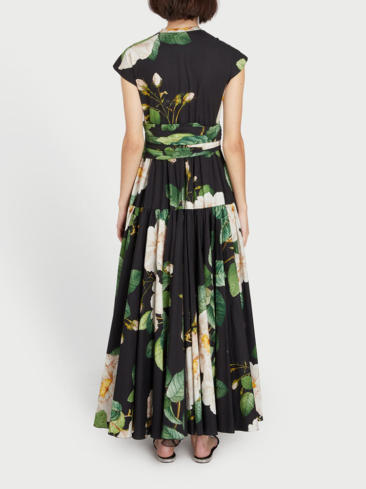 Cotton Blend Ankle Length Dress, Short Sleeve, Round Neck, Floral Print, Loose F