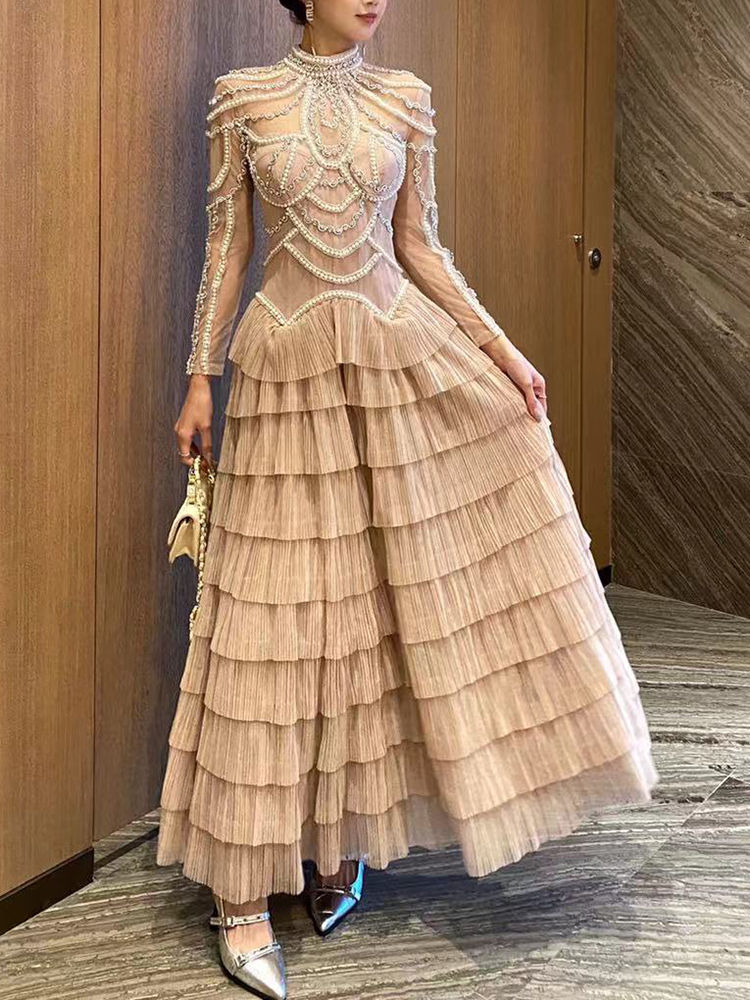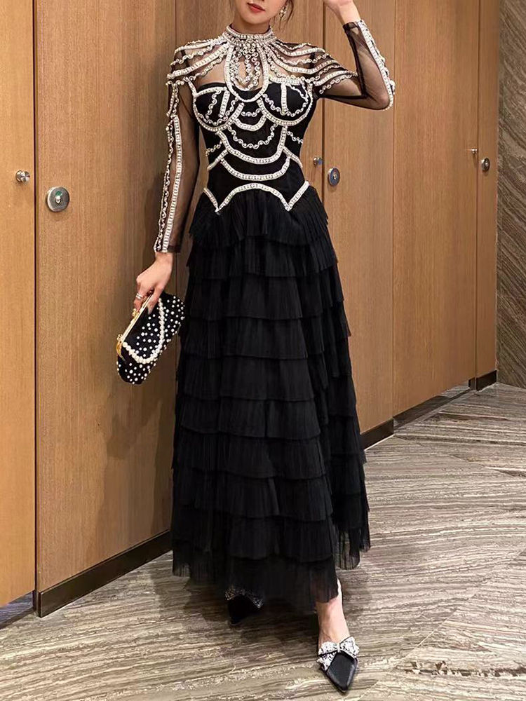 O-Neck Patchwork Evening Dress, Full Sleeve Ankle-Length Diamond Gown
