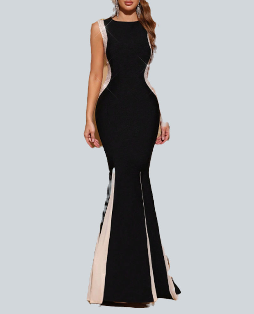 Sleeveless Patchwork Slim Fit Long Dress O-Neck Trumpet Mermaid Floor-Length Dre