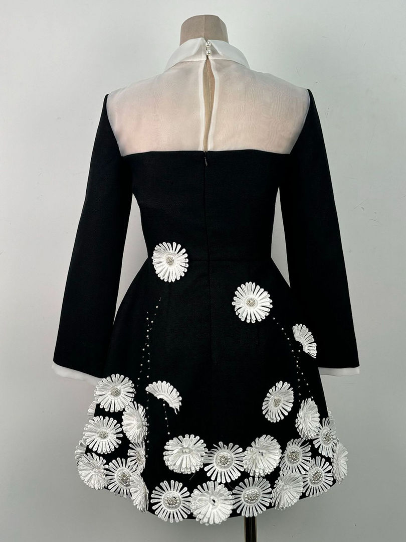 Spliced Appliques Mini Dress with Floral Pattern, Turn-Down Collar, Slim Fit & Z