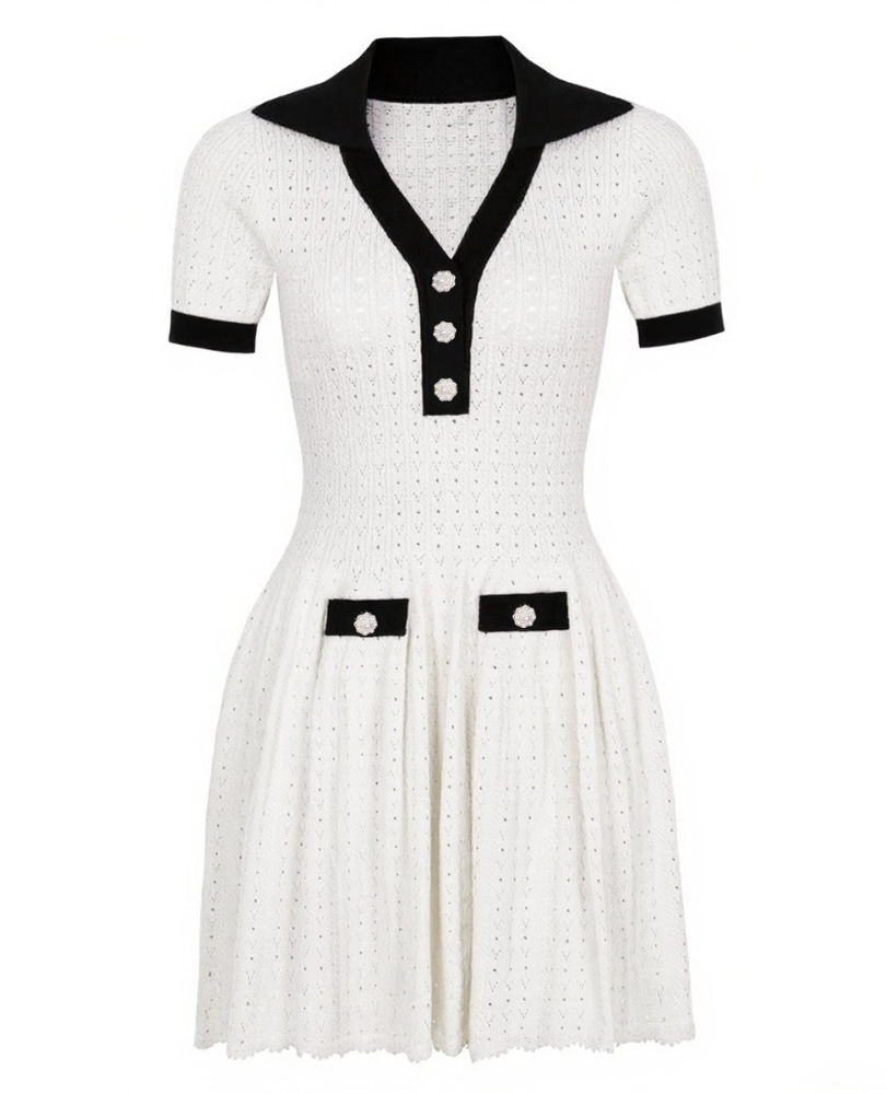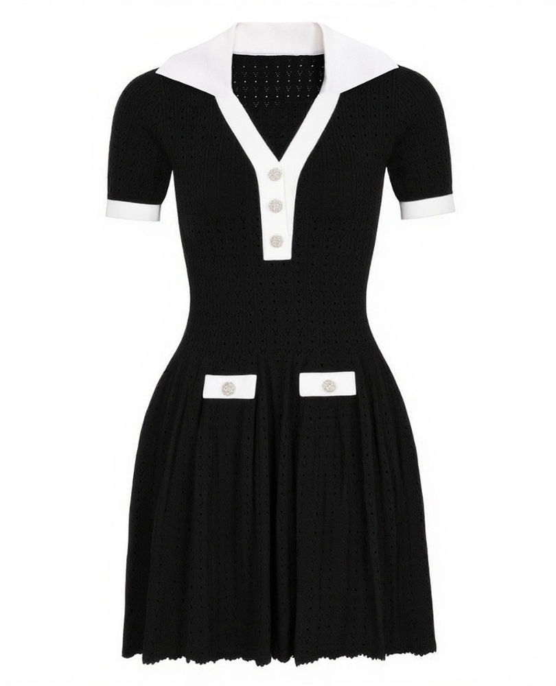 V-Neck Patchwork Mini Dress, Slim A-Line, Short Sleeve, Button, Knit, Spliced Dr