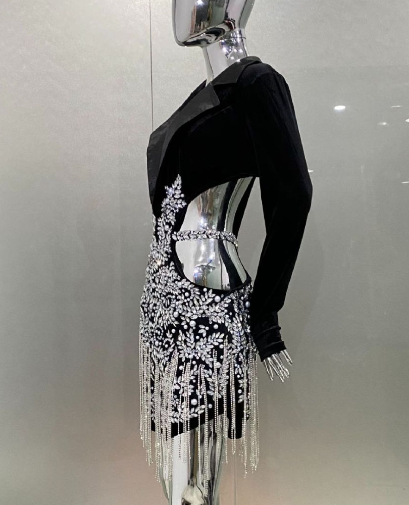 Mini A-Line Dress with Diamonds Decor, Turn-Down Collar, Full Sleeves, Slim Fit,