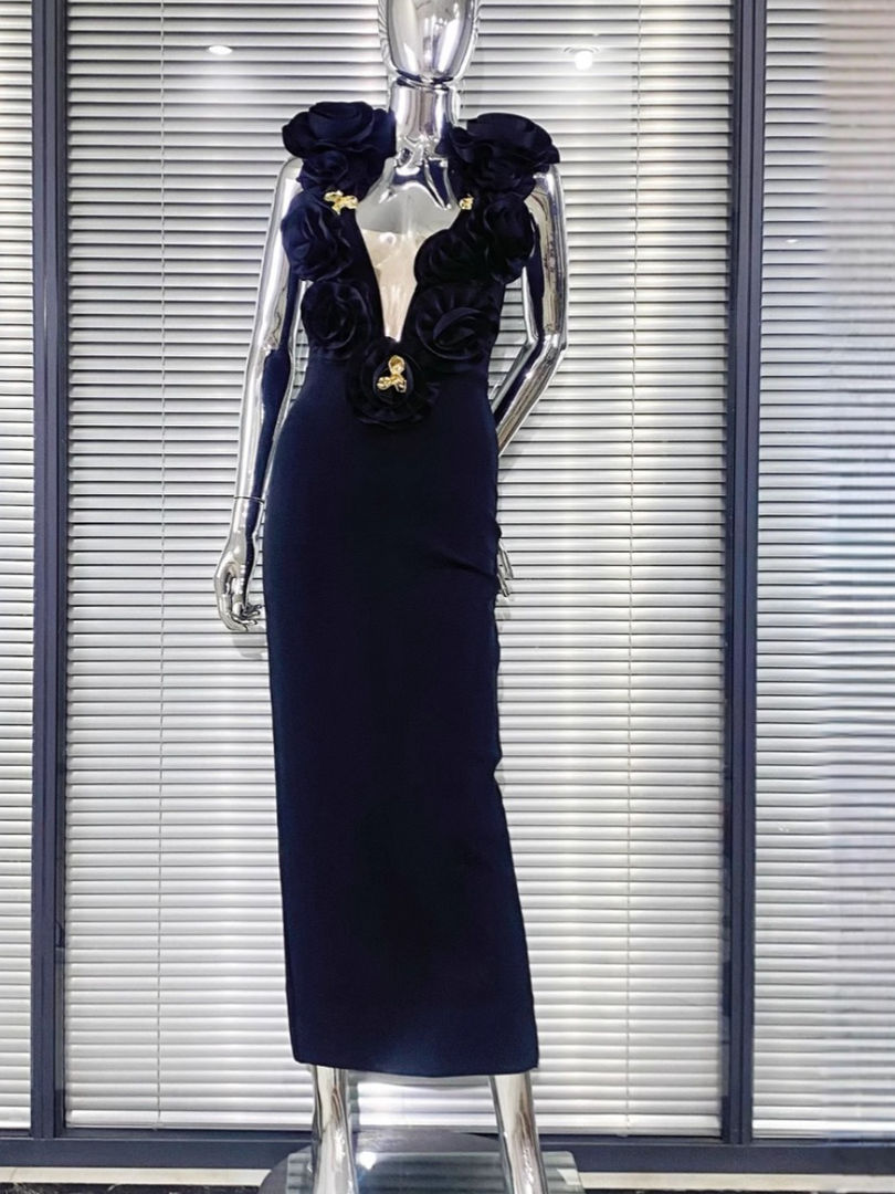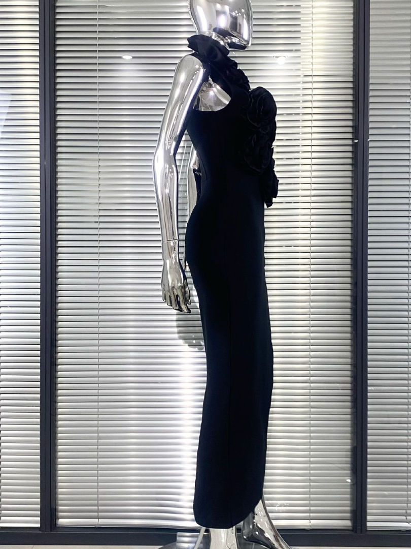 Sleeveless Halter Neck Ankle Length Slim Fit Sexy Dress with 3D Flower Decoratio