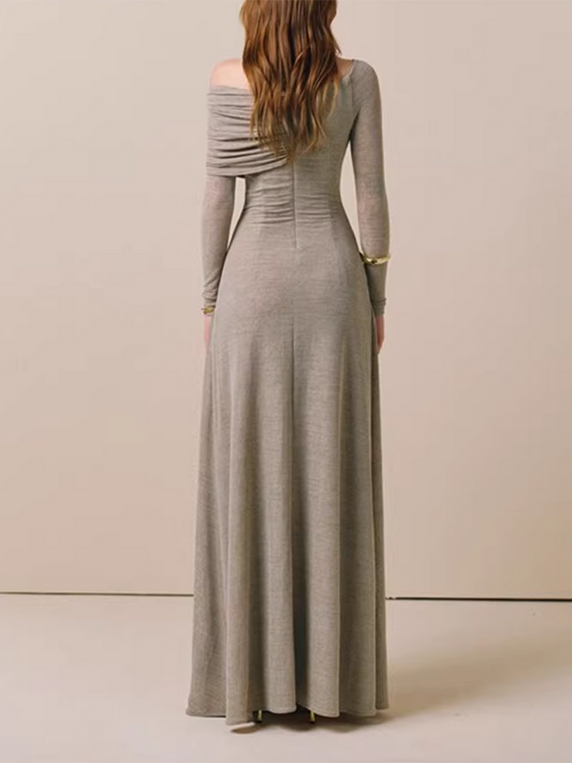 Tags:A-line floor length dress, diagonal collar dress women, slim fit summer dress, ruched detail maxi dress, minimalist long dress, casual spring dress, cotton blend formal dress, polyester blend evening dress, full sleeve maxi dress, natural waistline dress, woven fabric long dress, middle age women's dress, solid pattern floor length dress, zipper closure long dress.