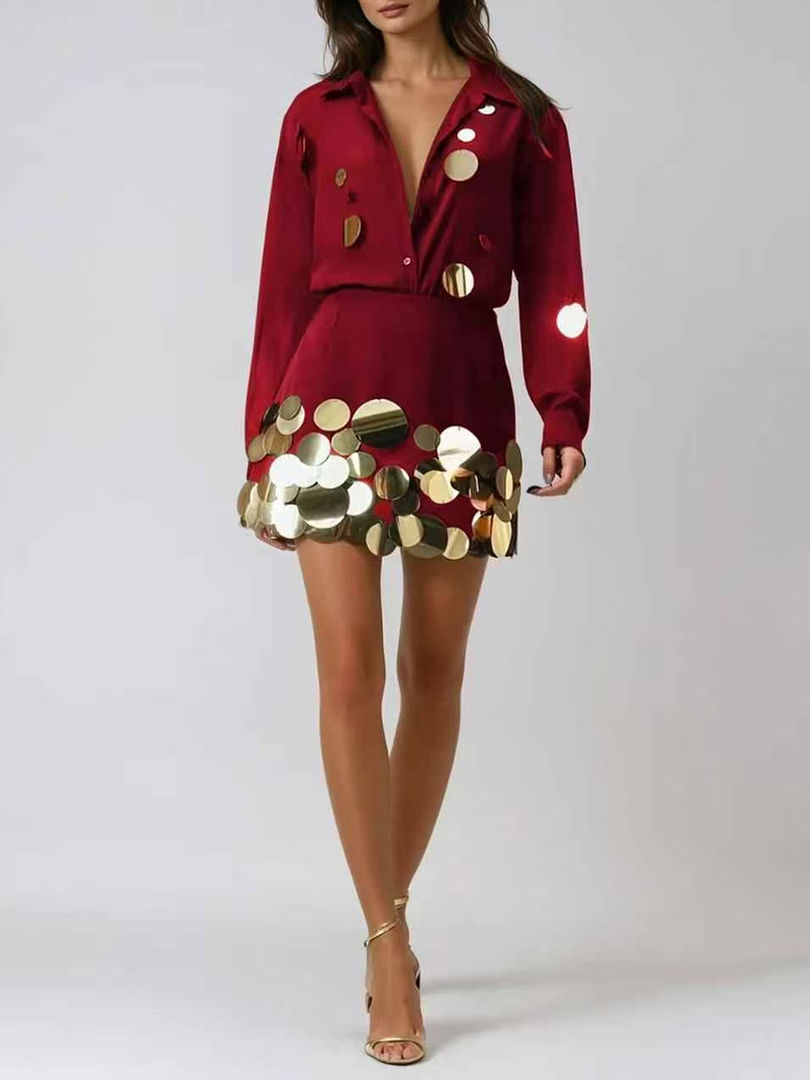 Two Piece Set, Sequins Lapel Long Sleeve Top, Mini Skirt, Polyester