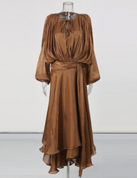 Solid Ankle-Length Dress, O-Neck, Long Sleeve, Loose A-Line, Folds, Zipper, Wove