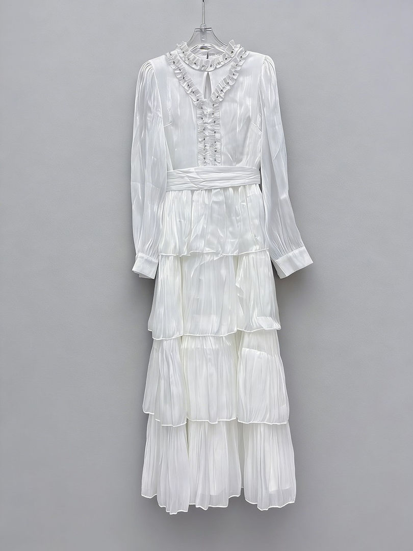 elegant A-line midi dress, women's polyester A-line dress, solid color ruffles dress, O-neck zipper closure dress, loose fit elegant dress, ankle length ruffle dress, spring autumn midi dress, casual elegant women's dress, empire waist A-line dress, woven polyester dress for women, non-stretch elegant dress, tatting craft ruffle dress, middle age women's fashion dress, women's solid pattern dress