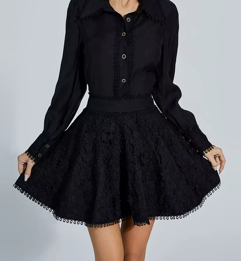 Tags: women's two piece set with embroidery, solid turn down collar top, polyester a-line dress, casual loose fit set, spring summer women's fashion, middle age women's clothing, embroidered dress set, regular length top, mini a-line dress, tatting craft clothing, woven fabric fashion, button fly pant set, single breasted top style, full sleeve casual top