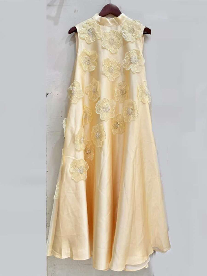 Solid Patchwork Applique Dress, Sleeveless O-Neck Ankle-Length, Fit & Flare