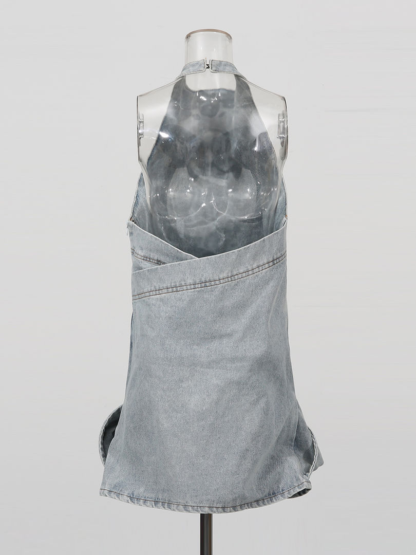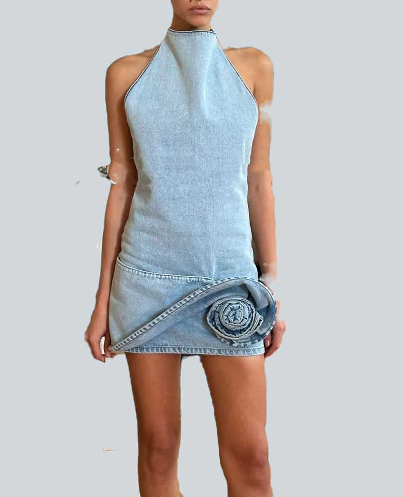 Sleeveless Mini Dress High Neck A-Line Solid Cotton Polyester Blend Zipper Closu