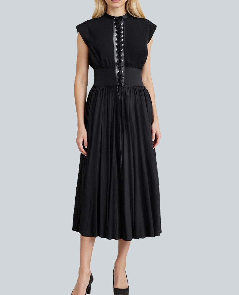 Solid Color Sleeveless Mid-Calf A-Line Dress with Lace-Up Detail, O-Neck, Slim F