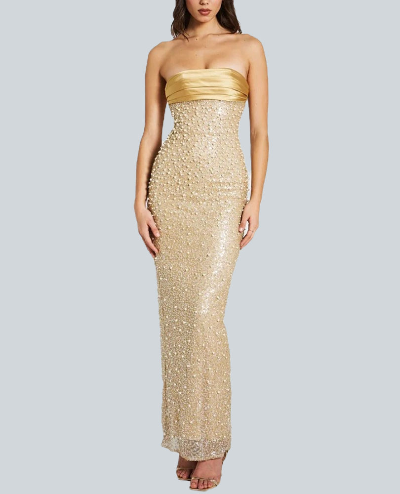 Solid Strapless Sequin Spliced Slim Fit Sheath Dress, Floor Length Cotton Blend
